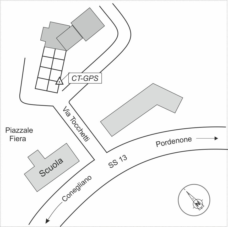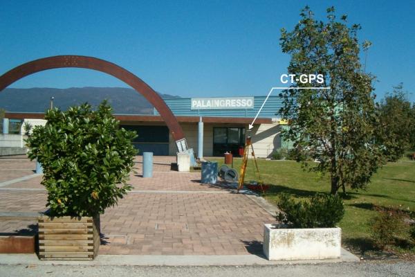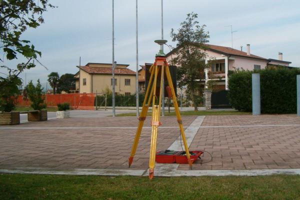 Centrino in acciaio inox del tipo "GPS" da livellazione infisso sul cordolo di cemento del piazzale antistante il palaingresso alla fiera, in corrispondenza dello spigolo di nord-est.