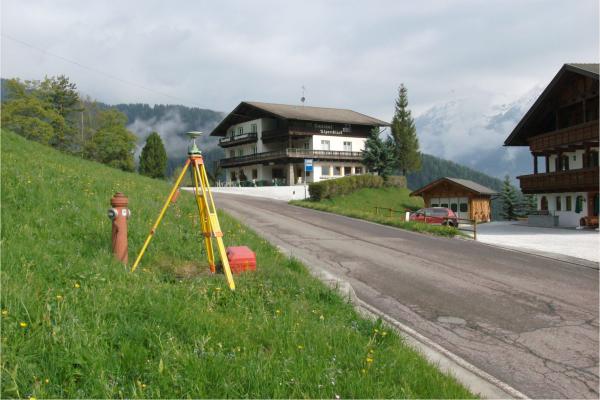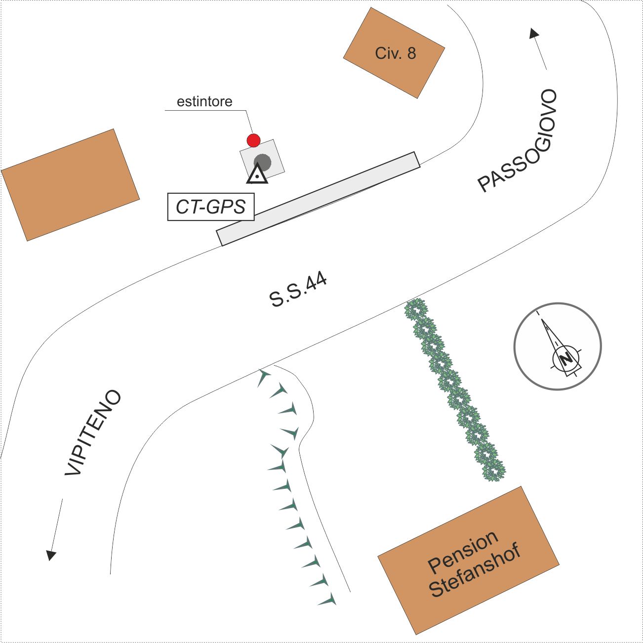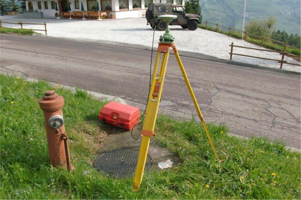 | materializzazione | Centrino in ascciaio inox del tipo "GPS" da livellazione infisso nel basamento im cemento di un estintore posto di fronte all'ingresso della "Pension Stefanshof". |