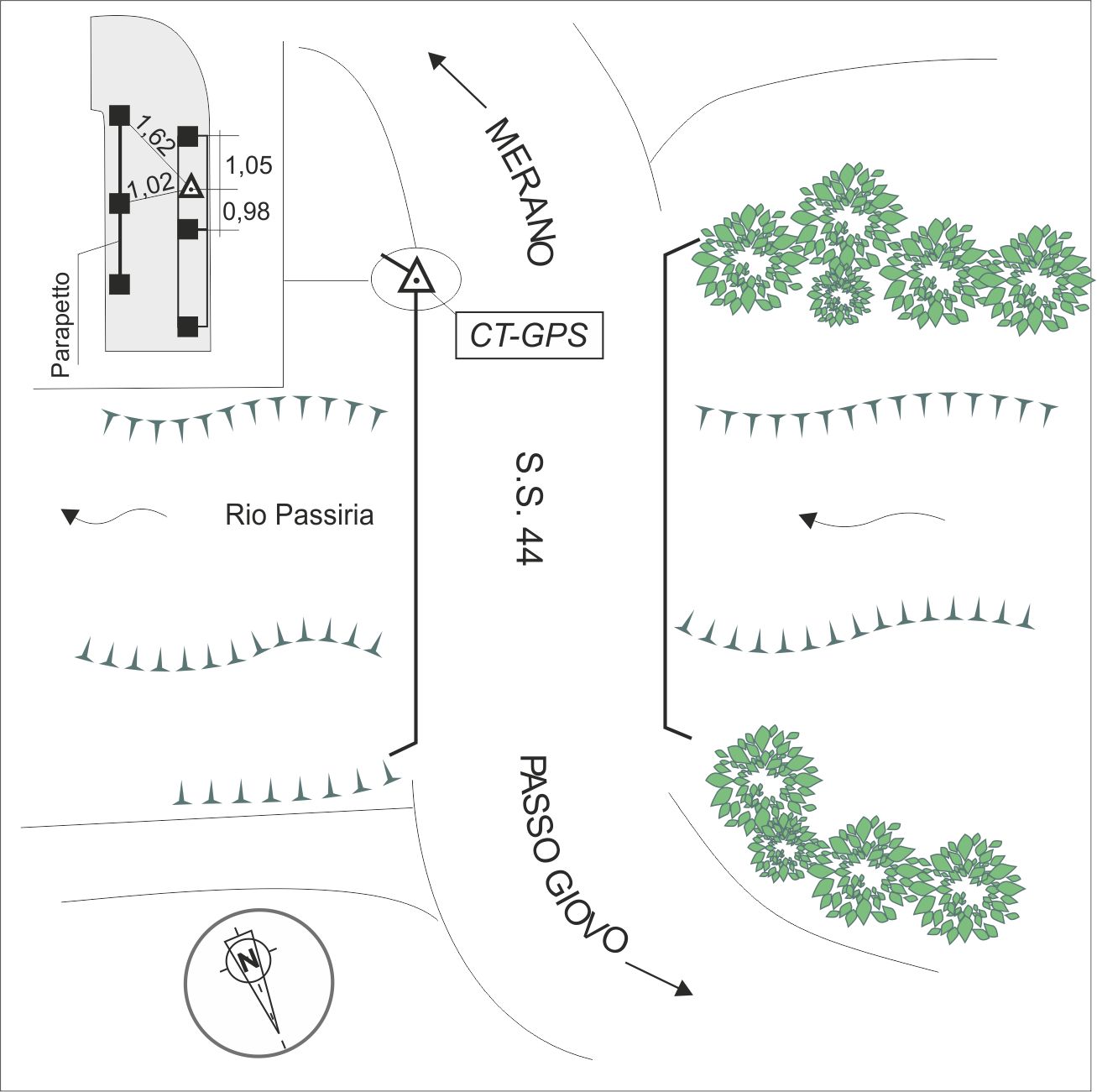 | materializzazione | Centrino in acciaio inox del tipo "GPS" da livellazione, infisso sul ponte in cemento armato, lato valle, del Rio Passiria. |