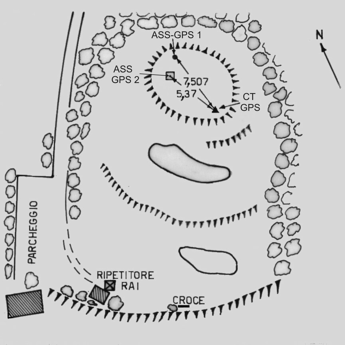 | materializzazione | Chiodo anonimo piatto a forma quadrata infisso al centro di una fondazione in cemento armato posta sulla sommità del monte. |