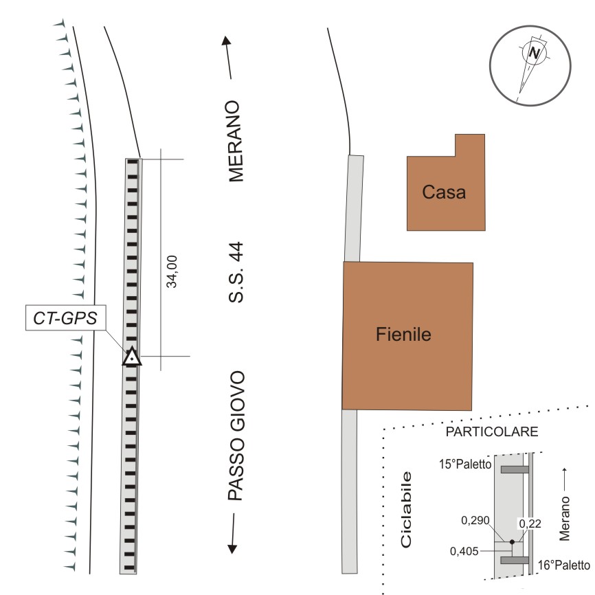 | materializzazione | Centrino in acciaio inox del tipo "GPS" da livellazione, infisso sul cordolo in cemento armato fra il 15esimo e il 16esimo paletto del guard rail, davanti ad un fabbricato adibito a fienile. |
