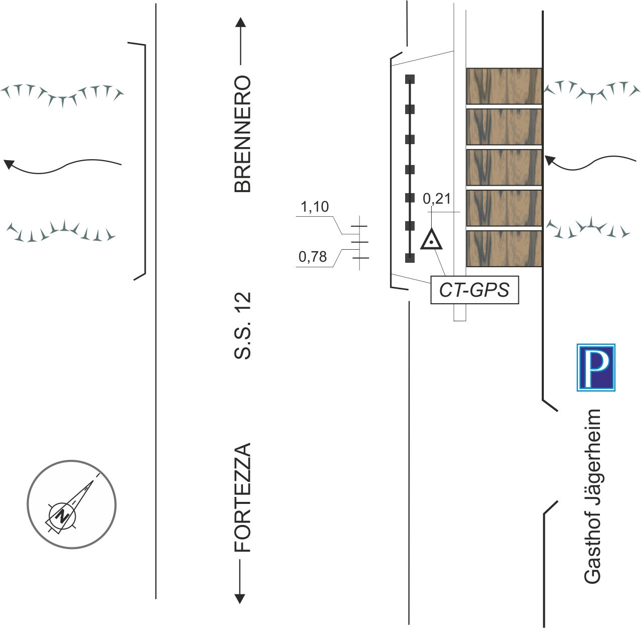 | materializzazione | Centrino in acciaio inox del tipo "GPS" da livellazione, infisso sulla struttura in cemento armato in prossimità del ponticello pedonale in legno. |