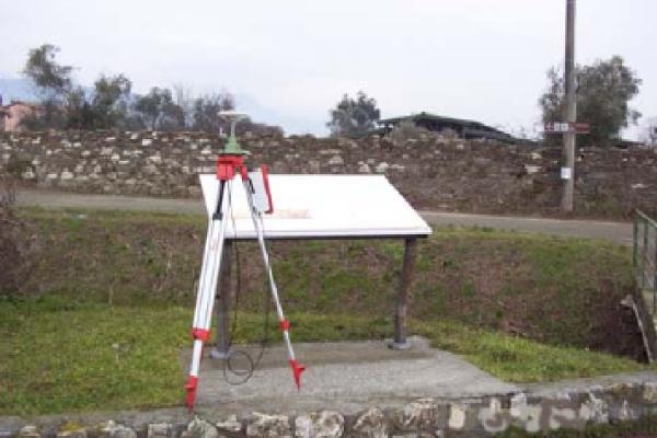 Centrino metallico infisso sul plinto in cemento armato che sorregge la tabella indicativa della zona archeologica, posta all'interno dell'area del parcheggio accanto a in ponticello.