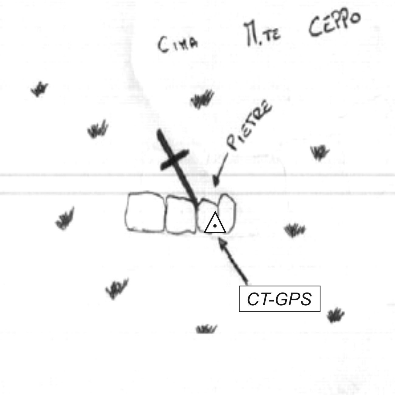 | Materializzazione | Centrino metallico infisso sulla sommità di un manufatto in cemento e pietrame sulla cima di Monte Ceppo. |