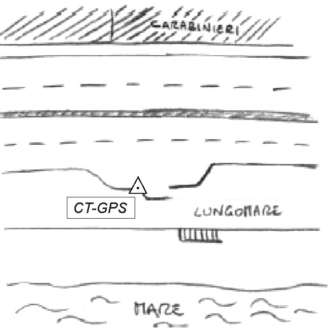 | materializzazione | Il Centrino metallico della Regione Liguria è stato sostituito con un altro contrassegno del tipo "survey" infisso sullo spigolo esterno di cordolo. |