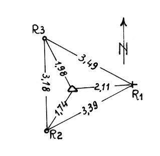 Segnale sulla parte più alta del monte. Centrino di superficie. Riferimenti: R1 croce incisa su roccia; R2, R3 centrini.