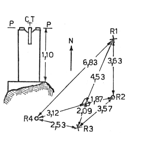 Tubo metallico affiorante alla sommità di un pilastrino in calcestruzzo sito su un ammasso roccioso alla sommità dell'altura omonima. Riferimenti: R1, R3 croci incise su roccia; R2, R4 centrini metallici.