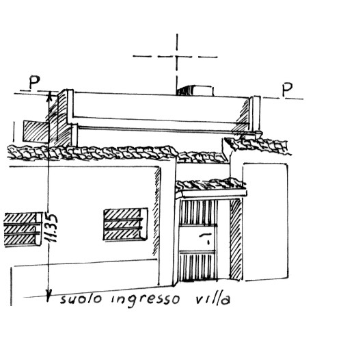 Segnale nello spigolo del pavimento superiore della villa, formato dal parapetto della terrazza ed il muro sud-est del casotto d'ingresso alla terrazza stessa. Centrino del tipo di fondo cementato.