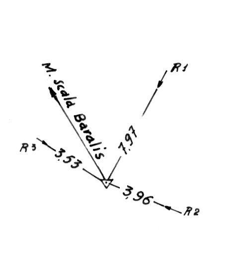 | Materializzazione | Segnale sul costone che si dirama in direzione nord-sud, lato nord del medesimo. Croce dipinta con minio su roccia affiorante. Riferimenti come da pianta. |