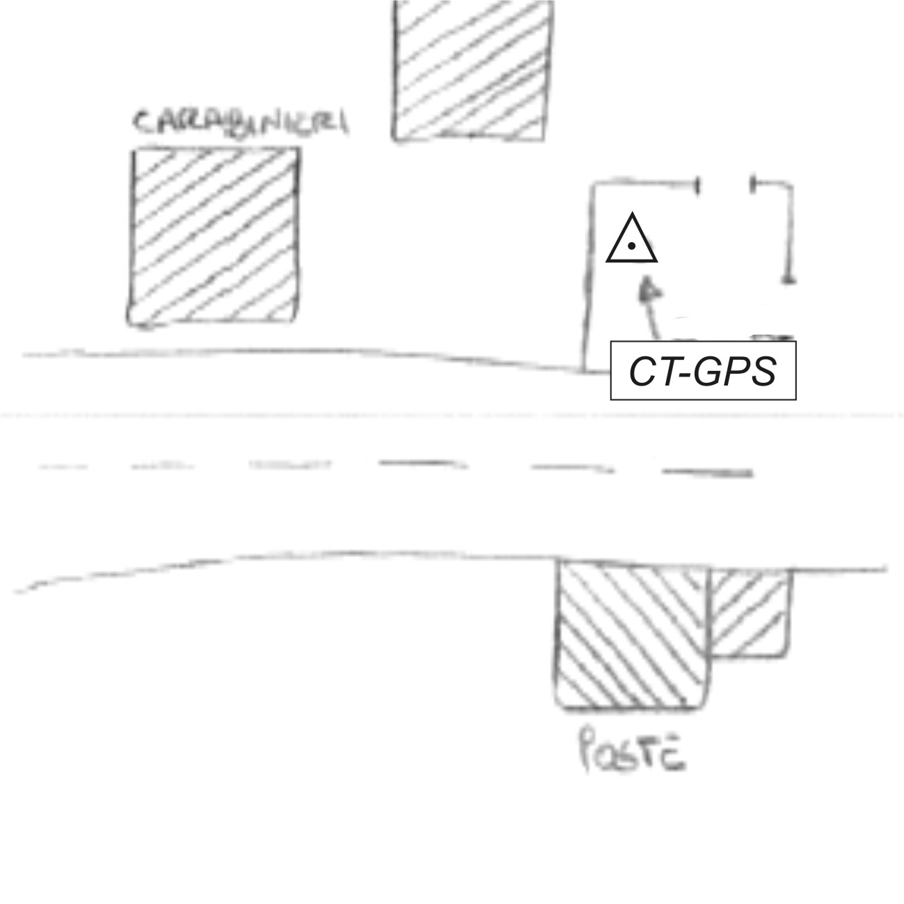 | Materializzazione | Centrino metallico infisso a destra sul pavimento in pietra dell'ingresso all parcheggio della scuola, di fronte all'ufficio postale. |