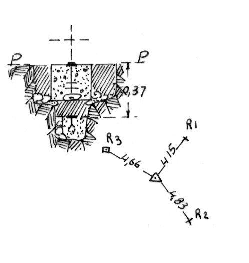 Segnale sulla sommità del colle pianeggiante. Centrino di superficie e di fondo. Riferimenti: (R1e R2) croci, (R3) centrino.