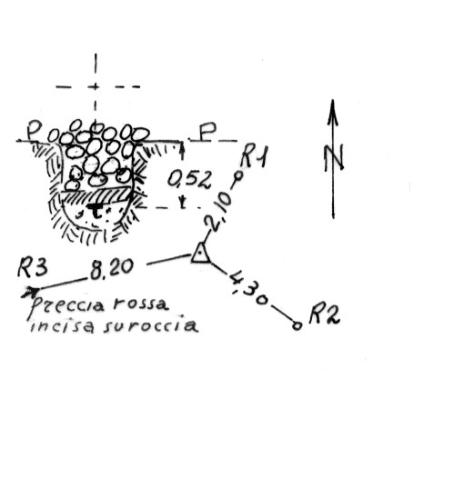 | Materializzazione | Segnale su un cocuzzolo situato nella parte centrale dell'altopiano. Centrino di fondo. Riferimenti:R1, R2 centrini, R3 freccia rossa su roccia. |