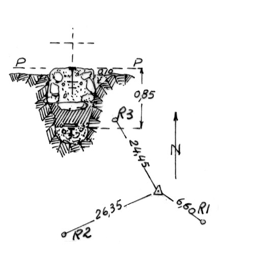 | Materializzazione | Segnale sul dorso più alto dello sperone omonimo. Centrino di superficie e di fondo. Riferimenti: tre incisioni a T a tre querce. |