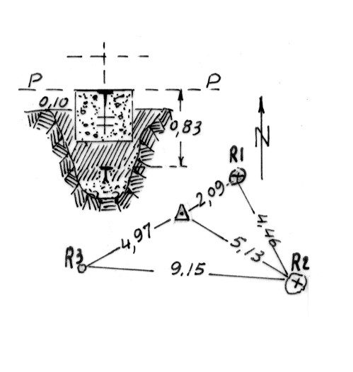 Segnale sul cozzo. Centrino di superficie e di fondo. Riferimenti: (R1, R2) croce incisa (R3) centrino.