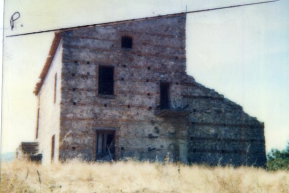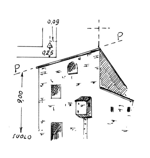Segnale sul muro al colmo tetto della facciata settentrionale della casa in contrada Moscosaccio. Centrino.