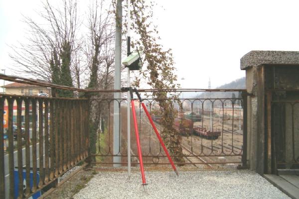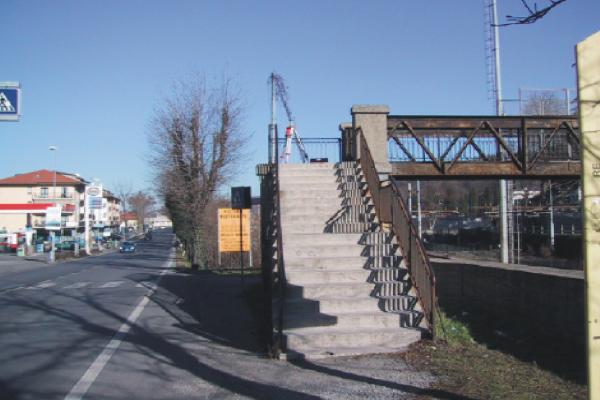 Centrino metallico infisso sul pianerottolo della scala del sovrapasso ferroviario, spigolo a ovest in Via Nazionale.