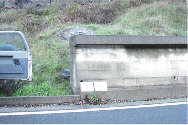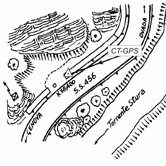 Centrino inox infisso all'estremità sud di un grosso muro di protezione al Km 78+400 della S.S.456 del Turchino, in località Gnocchetto.
