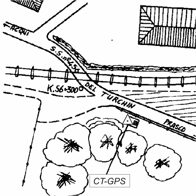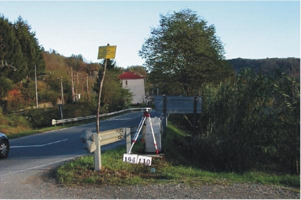 Centrino inox infisso sul basamento in calcestruzzo di un box elettrico situato in prossimità del Km 56+300 della ex S.S. 456 del Turchino, vicino al passaggio a livello.