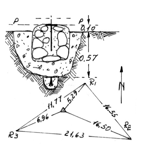 | Materializzazione | Segnale sul cocuzzolo omonimo. Centrini di fondo e di superficie in un blocco di calcestruzzo. Riferimenti: 3 incisioni a T a grossi massi circostanti. |