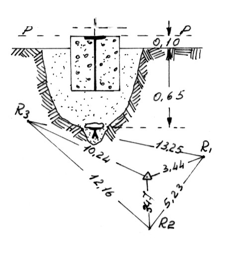 Segnale sull'ultimo cocuzzolo erboso. Centrini di fondo e di superficie in un blocco di calcestruzzo. Riferimenti: 3 centrini di riferimento.