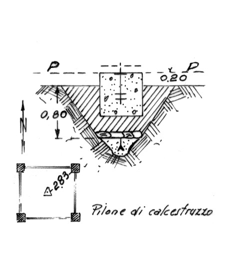 | Materializzazione | Segnale sotto il traliccio n. 49 della rete elettrica ad alta tensione sul costone che strapiomba sulla rotabile San Giovanni in Fiore-Caprino. Centrini di fondo e di superficie. Riferimenti: come da pianta. |