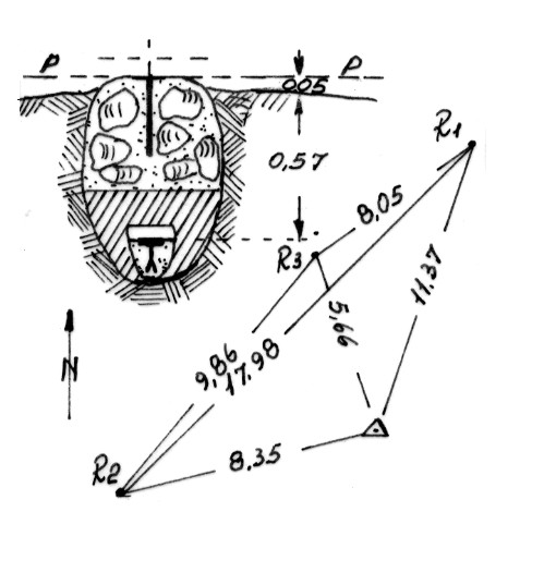 Segnale sul cocuzzolo omonimo. Centrini di fondo e di superficie in un blocco di calcestruzzo. Riferimenti: 3 T scolpiti su roccia.
