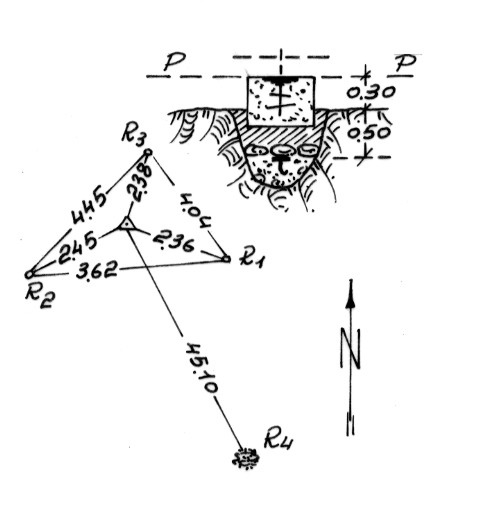 Segnale sulla serra omonima, 45 metri circa a nord ovest di un pino isolato. Centrini di fondo e di superficie. Riferimenti: R1, R2, R3, centrini. R4, pino isolato.