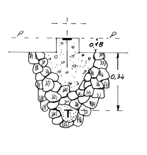 Segnale sullo sperone che dal contrafforte della regione Palombella scende sul lago Ampollino. Centrini di fondo e di superficie in un blocco di calcestruzzo.