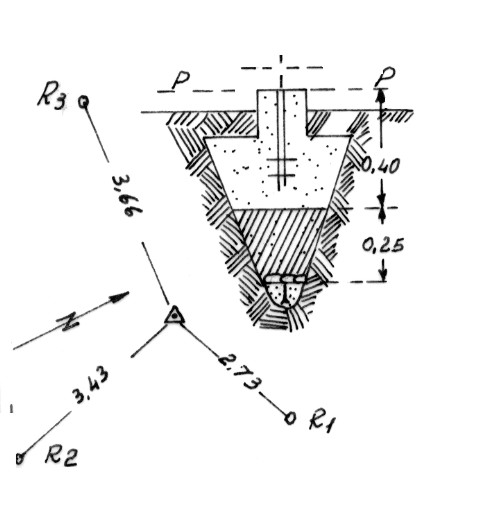 | Materializzazione | Segnale sulla parte più elevata di un cocuzzolo. Centrino di fondo e di superficie in un blocco di calcestruzzo. Riferimenti: come da pianta. |