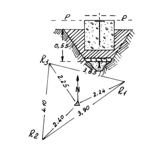 Segnale sul ciglio di un burrone alla confluenza del Senapido col Lese. Centrino di fondo in blocco di calcestruzzo con sovrastante pilastrino di cemento portante alla sommità un centrino di superficie. Riferimenti: come da pianta.