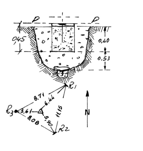 | Materializzazione | Segnale sulla collina erbosa, 10 metri a sud della parte più elevata. Centrini di fondo e di superficie in blocco di calcestruzzo. Riferimenti: 2 incisioni a T su roccia (R1, R2) ed un centrino di riferimento (R3). |