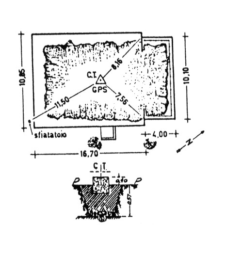Segnale sulla copertura del serbatoio dell'acquedotto. Centrino di fondo e sovrastante pilastrino in cemento con centrino GPS tipo "C" alla sommità. Riferimenti:come da pianta.