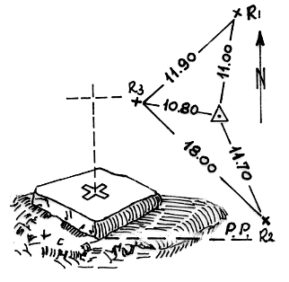 Segnale sul pianoro sito nella parte più alta del complesso di colline che trovasi a nord della foce del fiume Oliva. Croce scolpita su grossa pietra cementata su roccia. Riferimenti: Tre come da pianta.