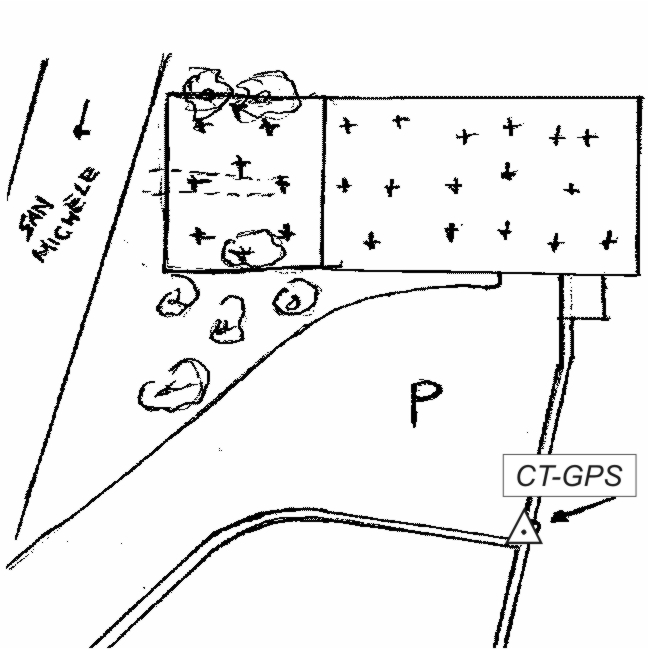 | materializzazione | Centrino metallico posto su un muro di sostegno in calcestruzzo del piazzale del parchegggio del cimitero |