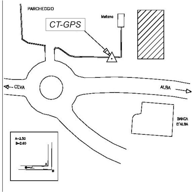 Centrino metallico infisso sulla sommità del cordolo aiuola del parcheggio di fronte alla "Banca D'Alba".