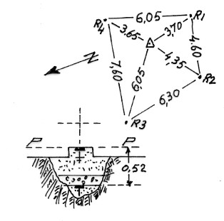 Segnale sulla sommità della montagna. Centrino di fondo cementato in una fessura della roccia e un centrino di superficie cementato in blocco di calcestruzzo, entrambi metallici. Riferimenti: n° 4 come da prospettino.