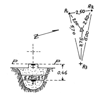 Segnale sul cocuzzolo roccioso. Centrini metallici di fondo e di superficie cementati in blocchi di calcestruzzo. Riferimenti: n°2 centrini cementati (R1,R2) croce incisa su roccia (R3).