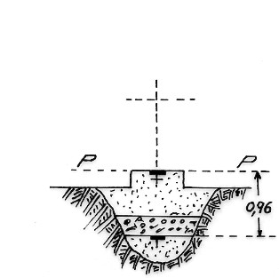 Segnale sulla sommità del monte boscoso. Centrini di superficie e di fondo metallici, cementati in blocco di calcestruzzo.
