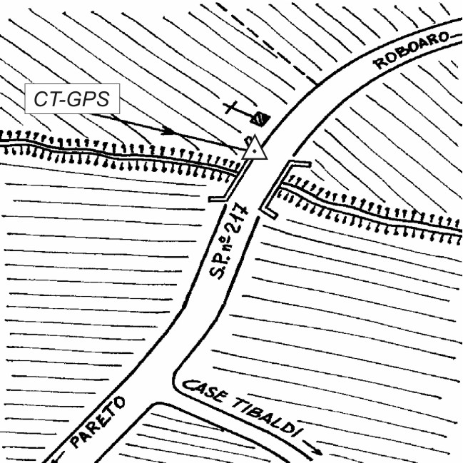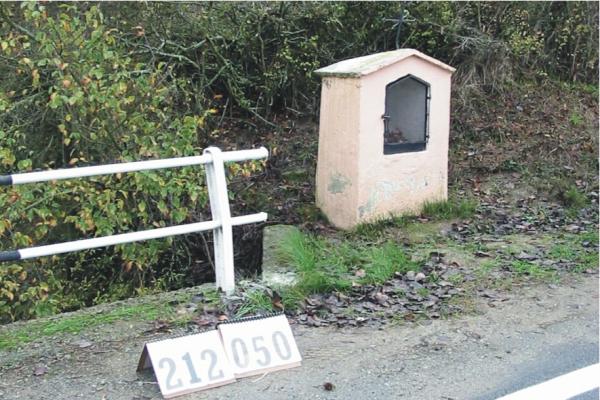 | materializzazione | Centrino inox infisso sullo spigolo convesso del cordolo del ponticello al km 8+900 della S.P. 217 in località Case Tibaldi. |