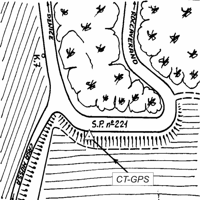 | materializzazione | Centrino inox infisso sullo spigolo nord di un piccolo manufatto situato al km 7+200 della S.P. 221 in Località Denice. |
