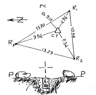 | Materializzazione | Croce incisa su pietra perfettamente squadrata e cementata al suolo. Riferimenti: tre bulloncini in acciaio inox fissati su grossi massi. |