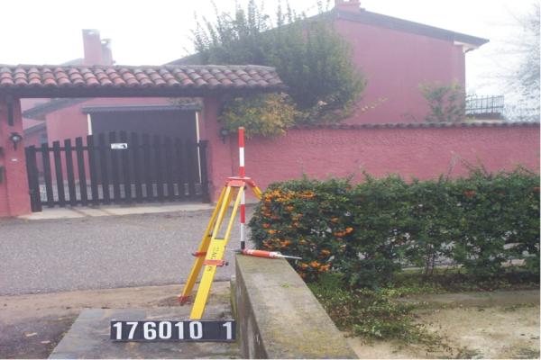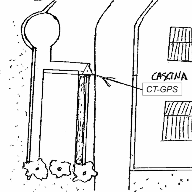 | materializzazione | Centrino metallico infisso su un cordolo in cemento armato della siepe di fronte all'ingresso alla cascina. |
