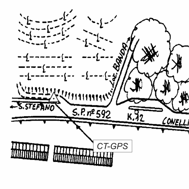| materializzazione | Centrino inox infisso all'estremità del muro di sostegno all'altezzo del Km 12+150 della S.P. 592, di fronte ad alcuni capannoni agricoli. |