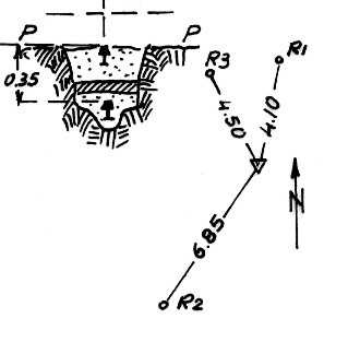 Segnale sul limite di un vigneto situato sulla parte più alta della collina che domina da N. E. il paese di Segariù. Centrini di profondità e di superficie cementati in blocco di calcestruzzo. Riferimenti: tre centrini metallici.