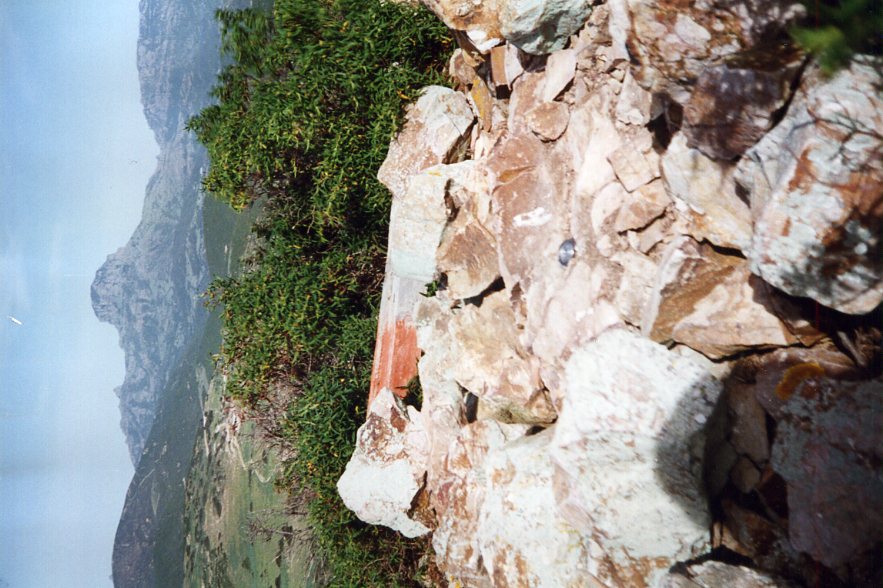 Segnale nella parte più elevata del monte. Centrino di fondo cementato su roccia. Centrino GPS "A" fissato sul centrino di fondo. Riferimenti: tre centrini metallici.