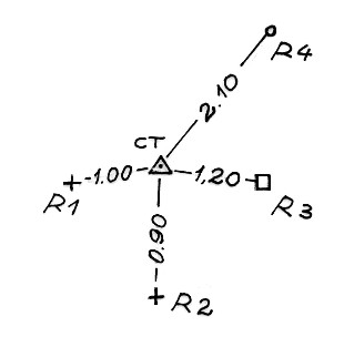 | Materializzazione | PIlastro di pietre a secco. Asse geometrico del pilastro. Riferimenti: due croci incise su roccia (R1, R2); un cippo della concessione Monteponi (R3); un centrino di confine comunale (R4). |