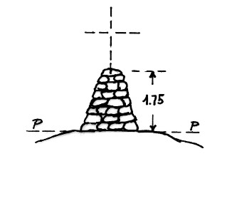 Segnale sulla puntina tondeggiante ricoperta da bassi cespugli. Pilastro piramidale di pietrame. Asse geometrico del pilastro.