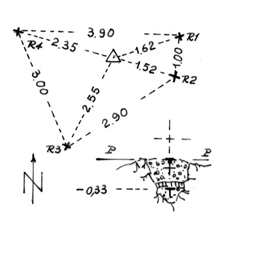 | Materializzazione | Segnale nel punto più alto della collina. Centrino di fondo cementato alla roccia, e sovrastante, in blocco di calcestruzzo, centrino di superficie. Riferimenti: quattro croci incise e miniate. |