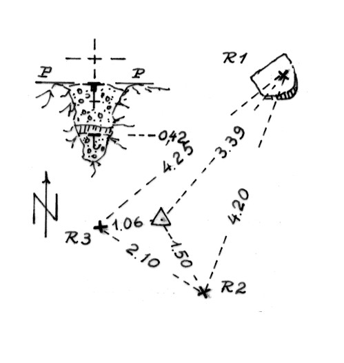 Segnale sulla cima rocciosa del monte. Cen. di fondo e di superficie nella spaccatura di una roccia affiorante. Riferimenti: tre croci incise.