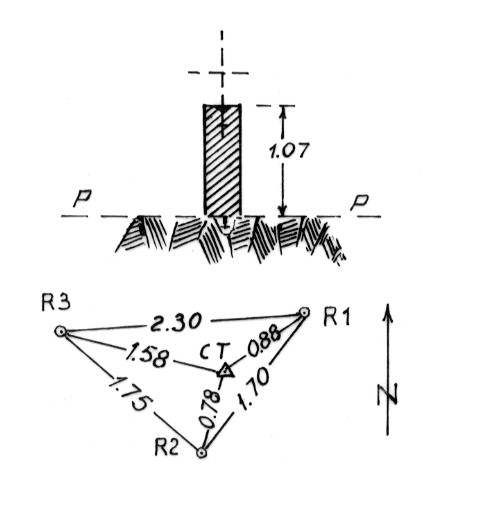 Segnale sul punto più elevato del monte. Centrino cementato su roccia fissa e sovrastante pilastrino in muratura di mattoni con centrino di superficie alla sommità. Riferimenti: Tre centrini cementati su roccia.